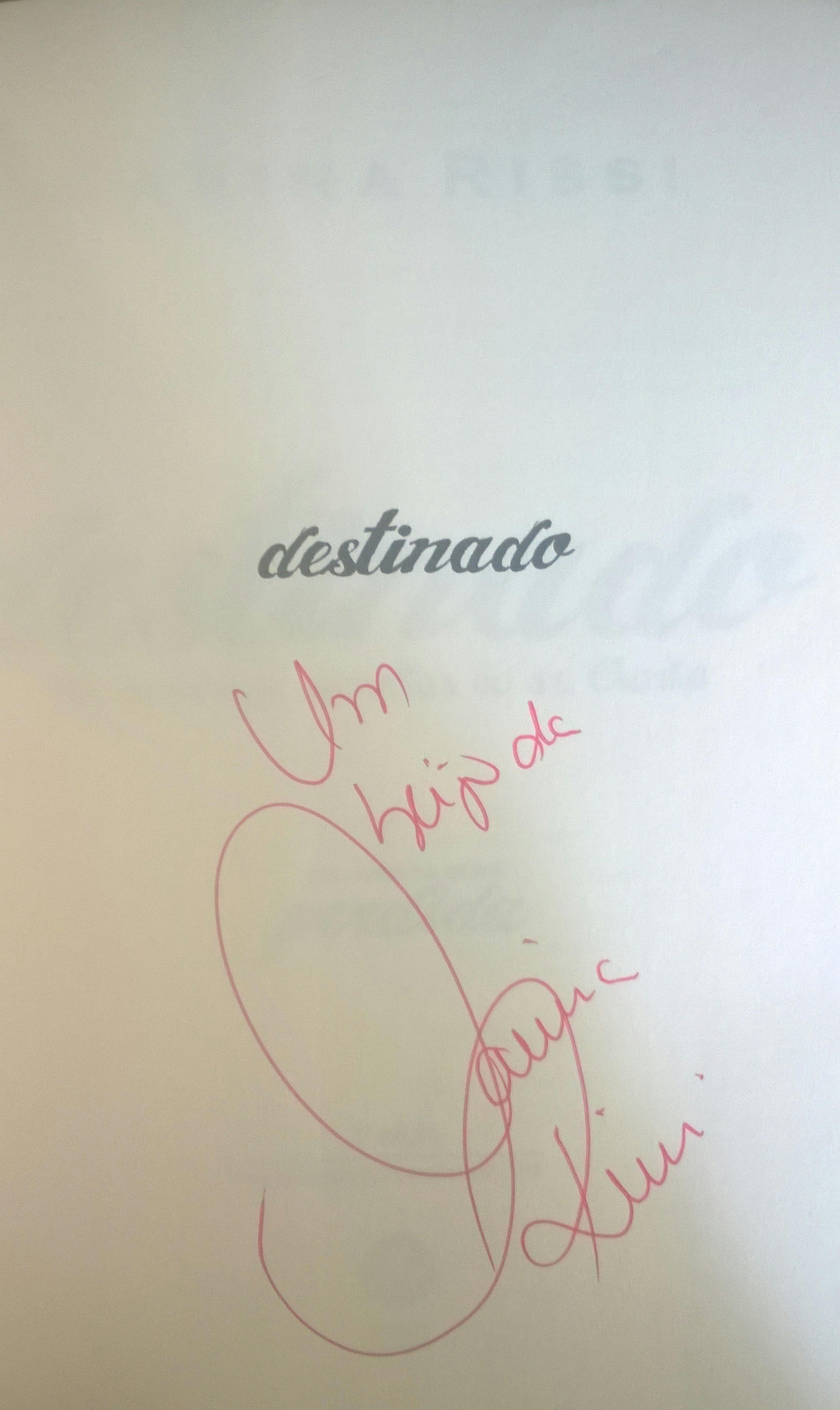 Destinado, o terceiro livro da série Perdida da Carina Rissi, comprei autografado na pré-venda e estava morrendo de curiosidade para ver como seria esse autógrafo; acabei ficando um pouco decepcionada, mas entendo que deve ser difícil autografar livros sem saber quem vai comprá-los